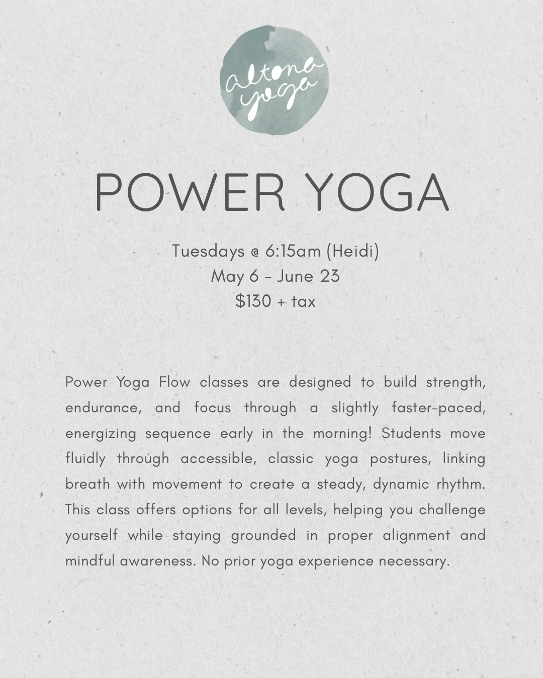 Power Yoga Flow classes are designed to build strength, endurance, and focus through a slightly faster-paced, energizing sequence early in the morning. Students move fluidly through accessible, classic yoga postures, linking breath with movement to create a steady, dynamic rhythm. This class offers options for all levels, helping you challenge yourself while staying grounded in proper alignment and mindful awareness. No prior yoga experience necessary.