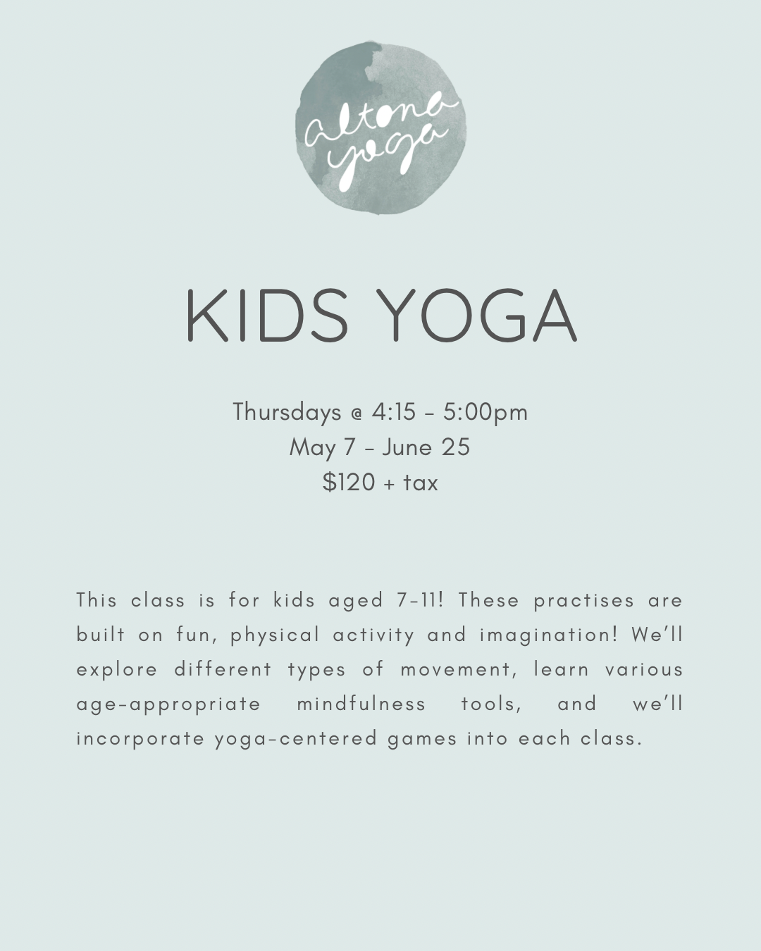 This class is for kids aged 7-ll. These practises are built on fun, physical activity and imagination! We'll explore different types of movement, learn various age-appropriate mindfulness tools, and we'll incorporate yoga-centered games into each class.