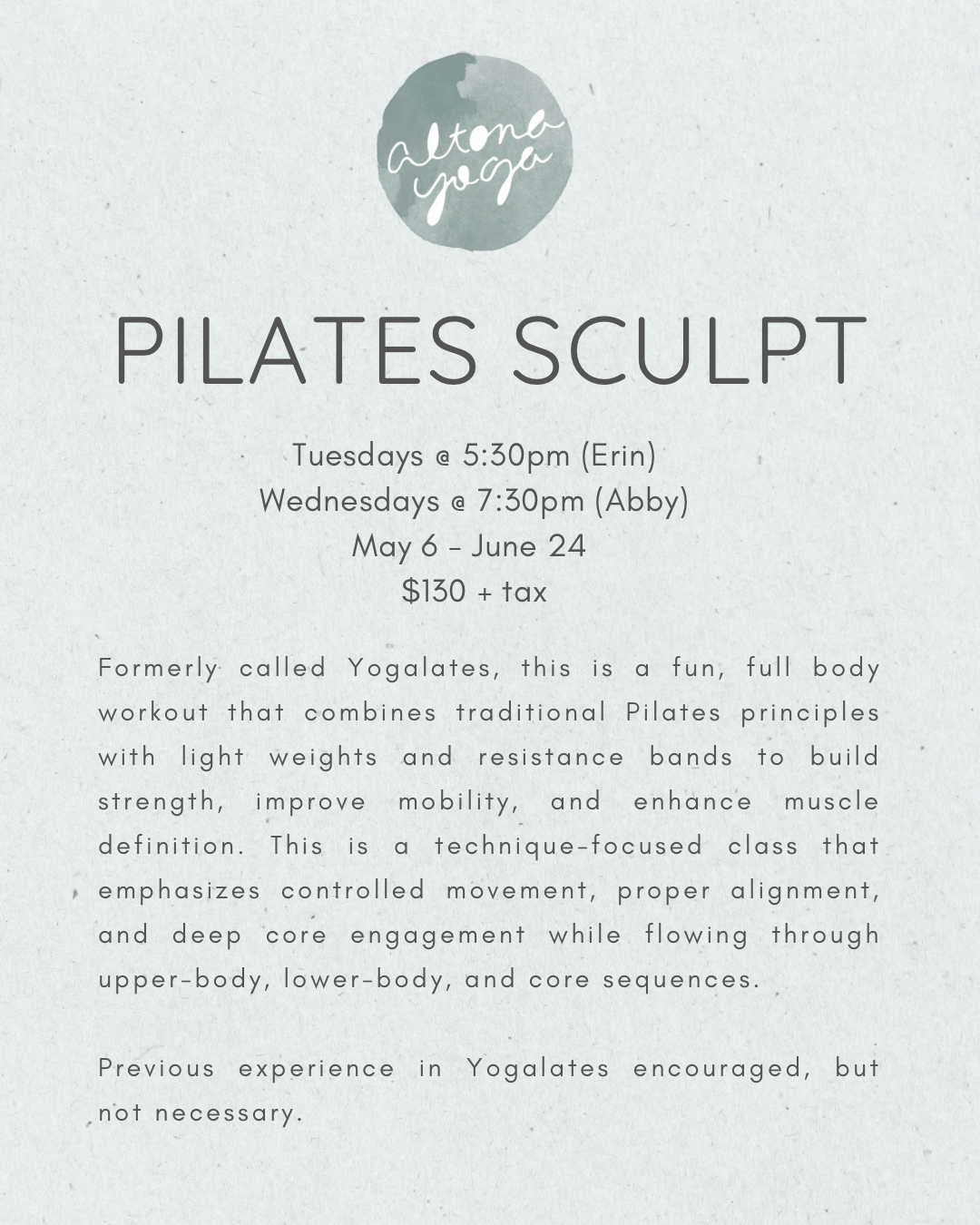 Formerly called Yogalates, this is a fun, full body workout that combines traditional Pilates principles with light weights, pilates balls and resistance bands to build strength, improve mobility, and enhance muscle definition. This is a technique-focused class that emphasizes controlled movement, proper alignment, and deep core engagement while flowing through upper-body, lower-body, and core sequences. Previous experience in Yogalates encouraged, but not necessary.